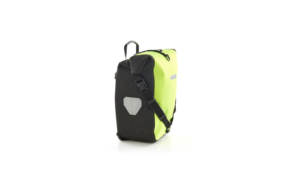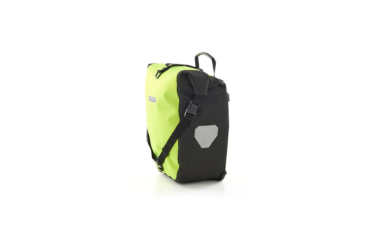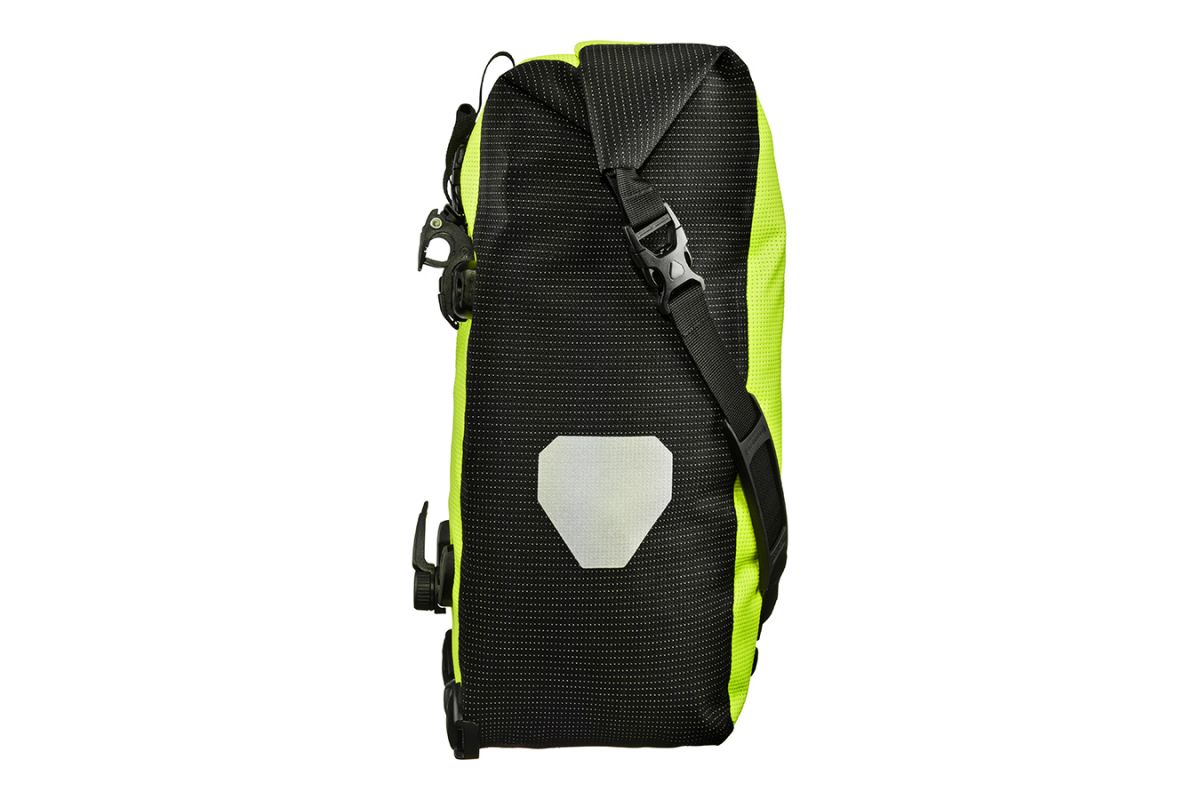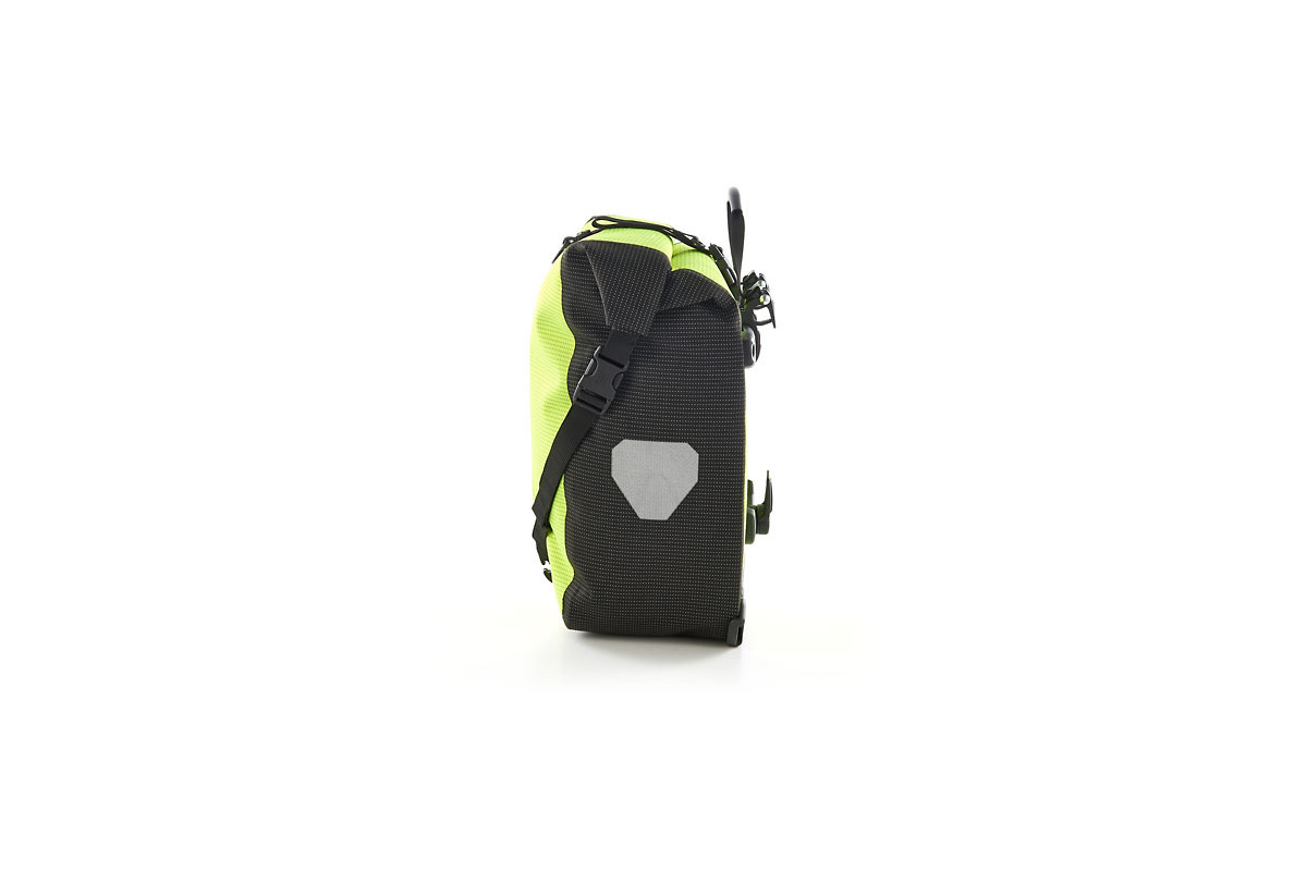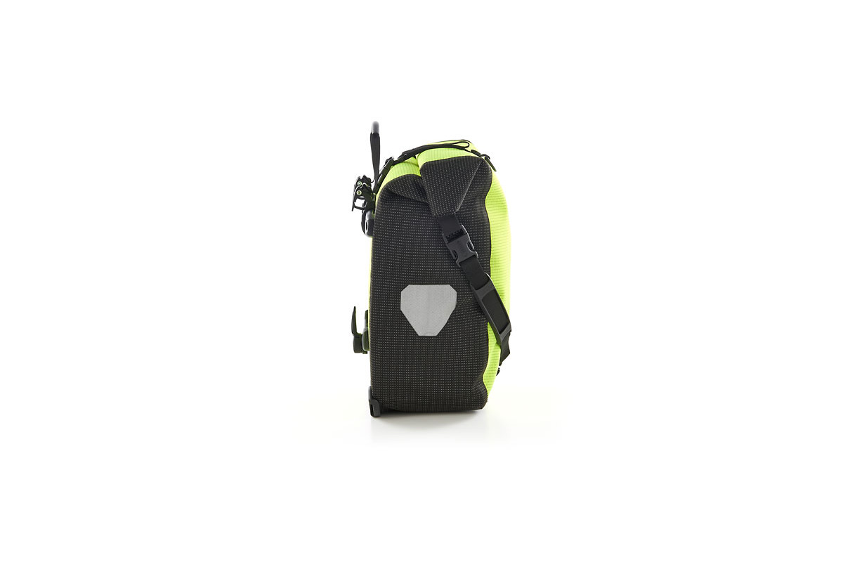 Een briljant idee voor alle fietsers die het hele jaar lang en die bij slecht weer fietsen: de ORTLIEB High Visibility Line verbetert enorm de zichtbaarheid van de fietser voor andere verkeersdeelnemers. Want de High Visibility tassen hebben niet alleen reflectoren – ze zijn zelf één enkele grote reflector. Daarvoor is het waterdichte PU-gecoate cordura-weefsel compleet met een lichtgevend reflecterend garen ingeweven – zowel in de kleur neongeel als in de kleur zwart. Dat maakt van de High Visibility tassen een uiterst doeltreffende veiligheidsmaatregel bij duisternis of schemering.