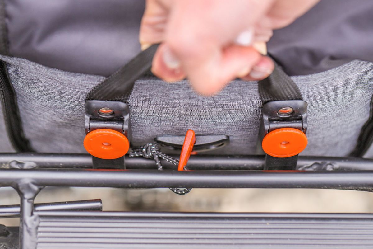 Onder de zak zit een gevouwen deksel om de zak te bedekken in geval van regen.