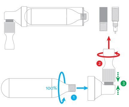 Zeer eenvoudig te gebruiken, schroef je het puntje aan de klep en druk je de opblazer tegen de klep om de CO2 vrij te geven.