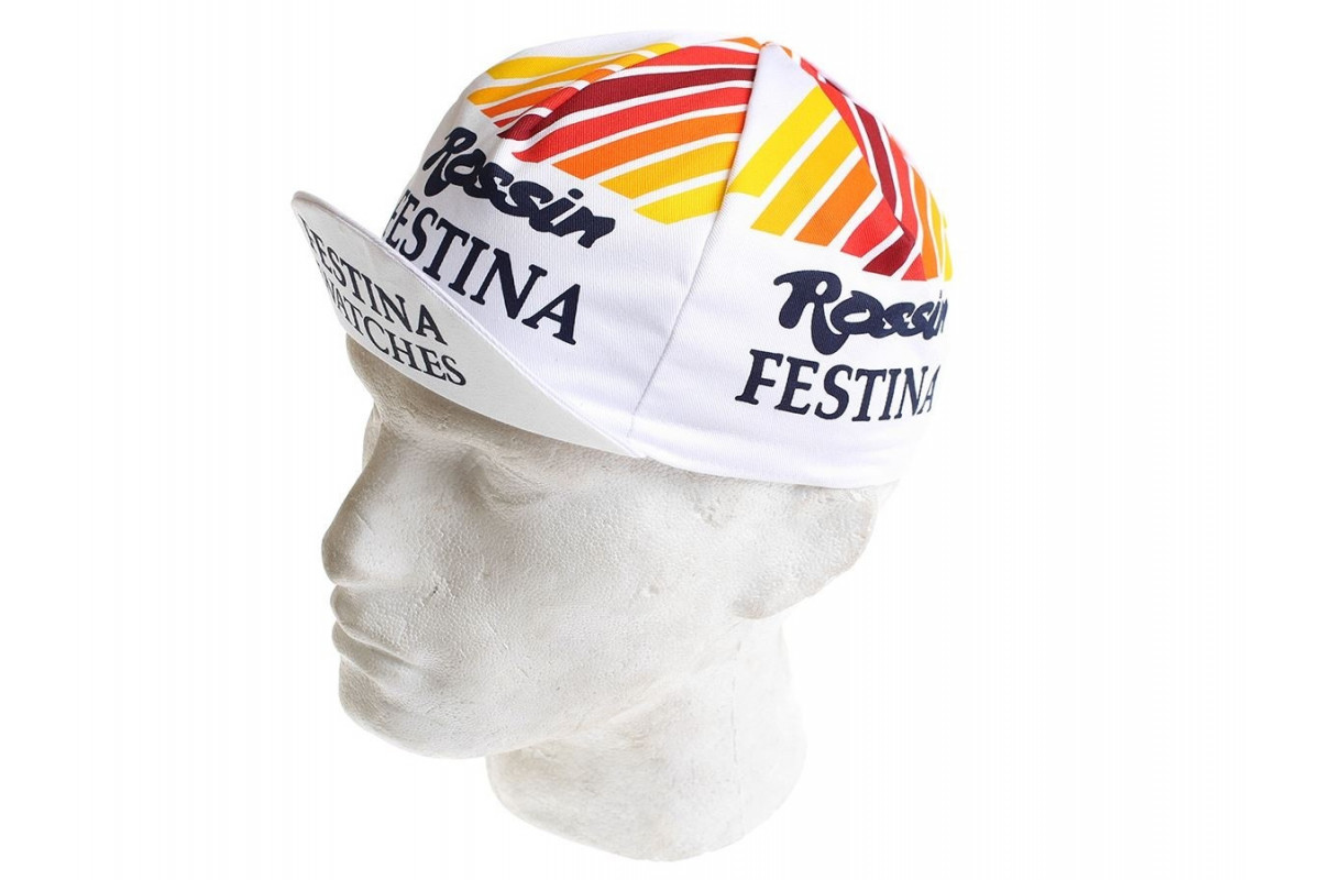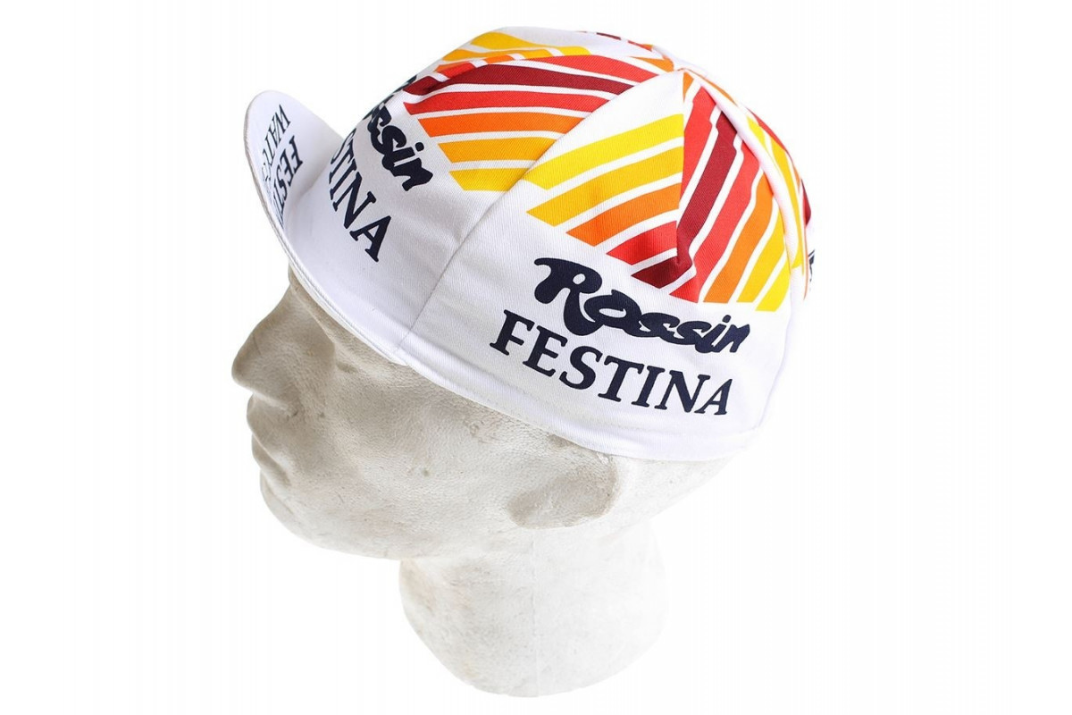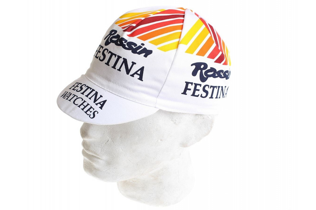 Een heel mooi vintage wielerpetje met de Festina/Rossin kleuren in een mooie vintage stijl.