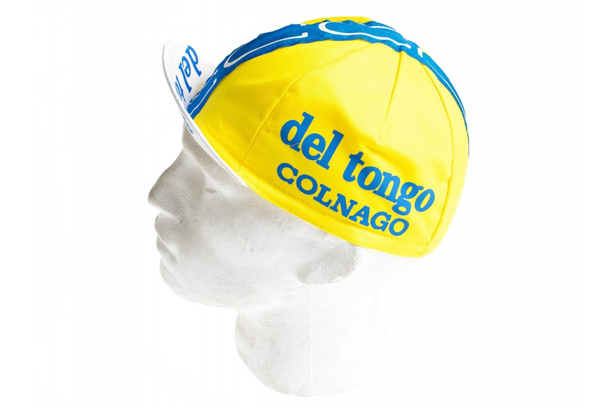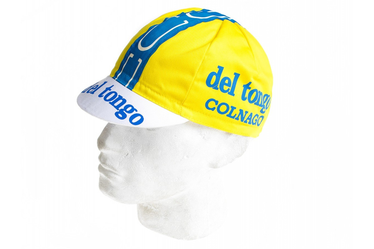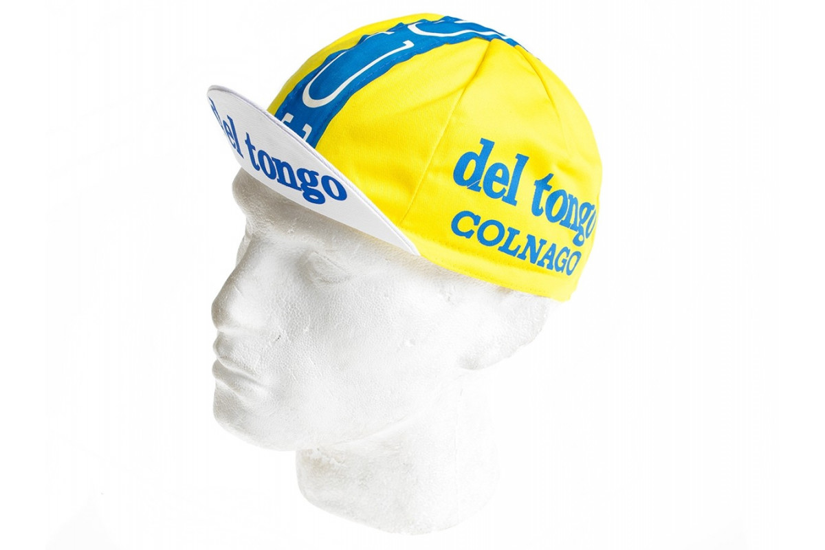Een fris gekleurd petje van 'Colnago del Tongo'. Deze opgeheven Italiaanse ploeg reed van 1982 tot 1991 in de koers. Met Mario Chipoloini domineerde ze destijds vele sprints.