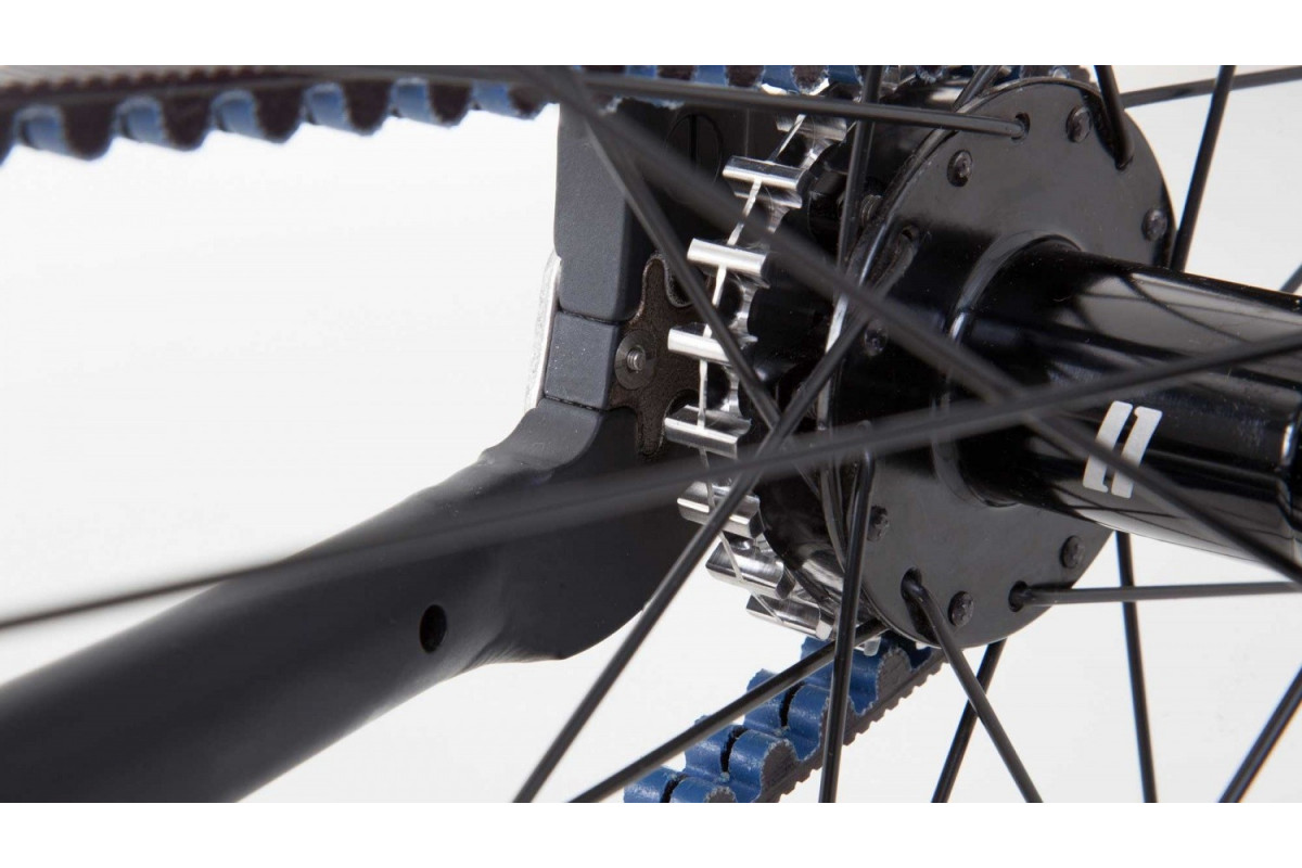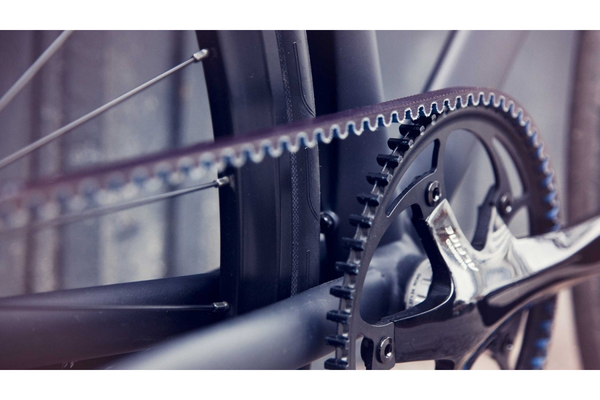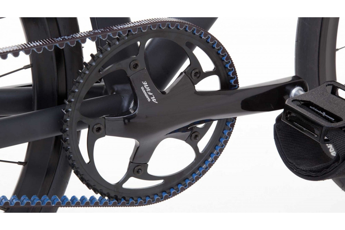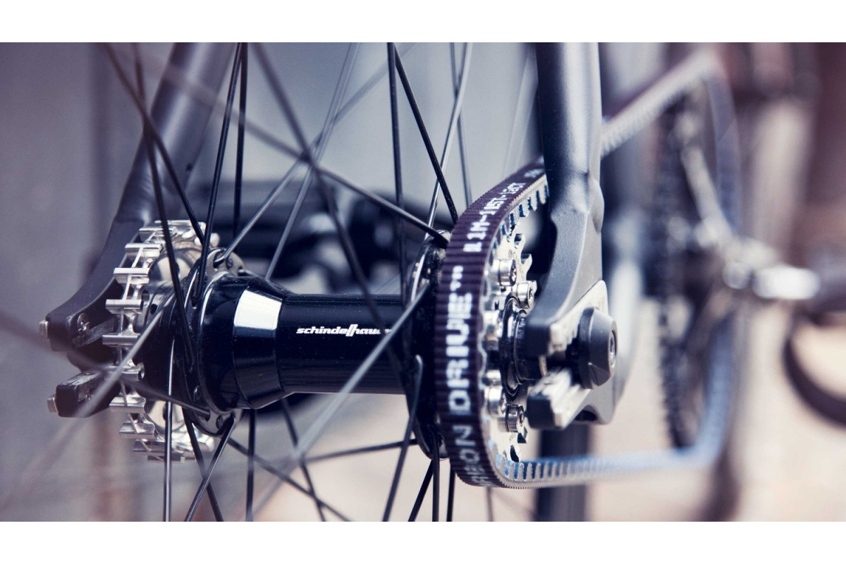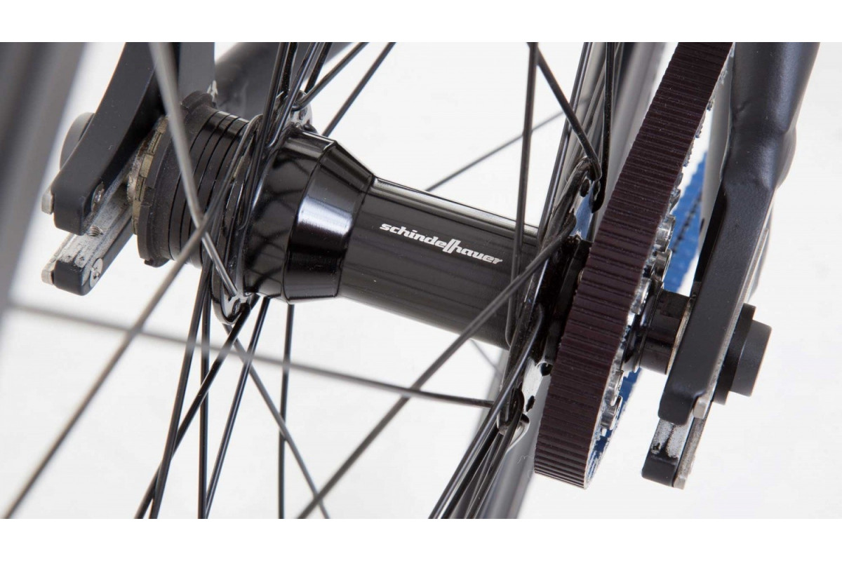 De 'Viktor' net als alle fietsen van het merk Schindelhauer uitgerust met een riemaandrijving om het verlies van energie, onderhoud en vetvlekken te beperken.