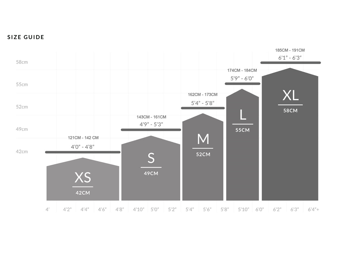 De fietsen zijn verkrijgbaar van 49 tot 58, hier is een indicatieve gids voor standaardmaten: