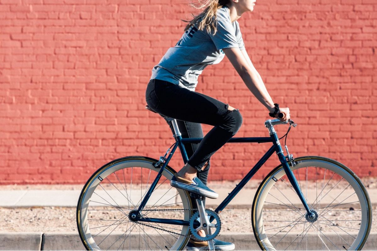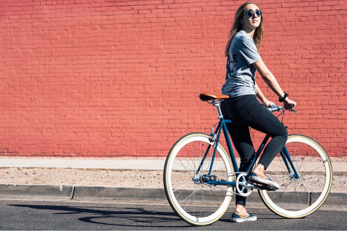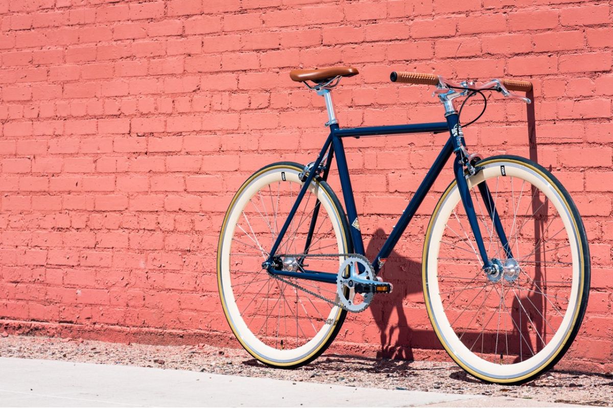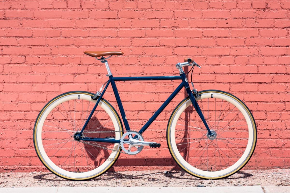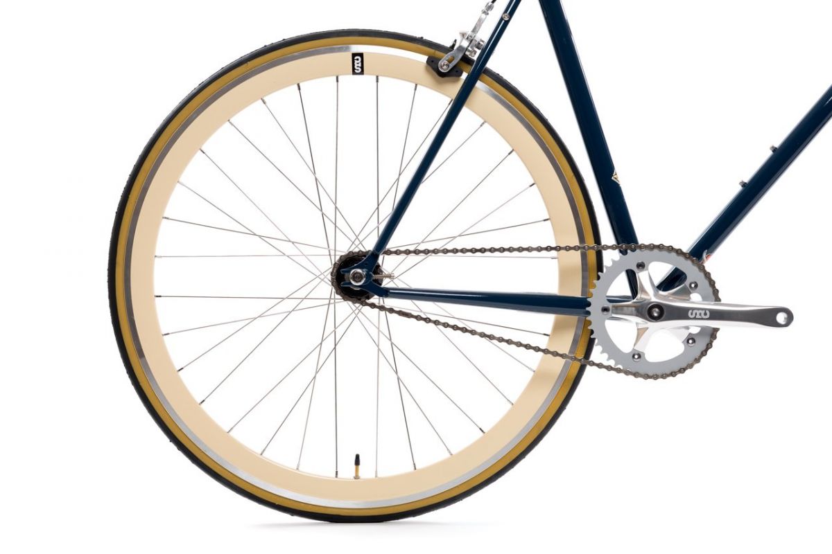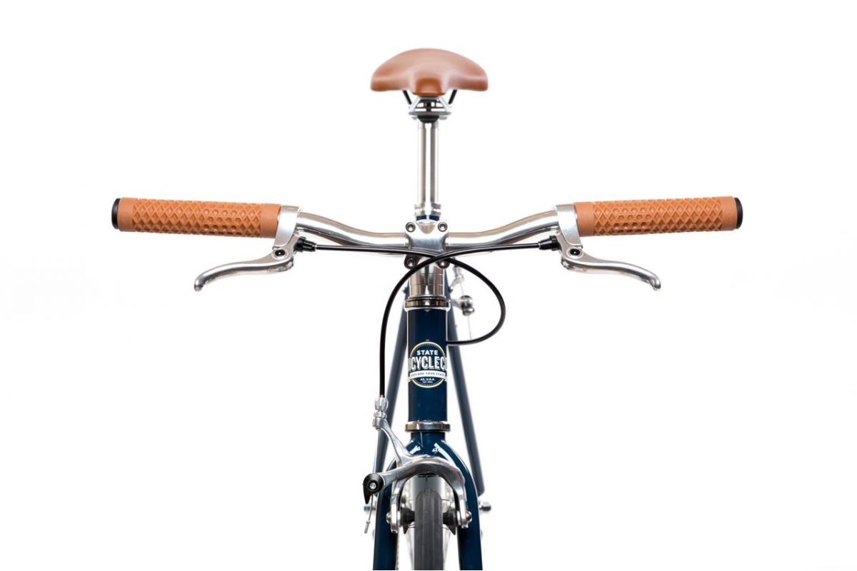 De fixie bike / singlespeed State Bicycle Rigby, in zijn vintage blauwe kleur geassocieerd met opvallende crème wielen, heeft geen gebrek aan charme.
