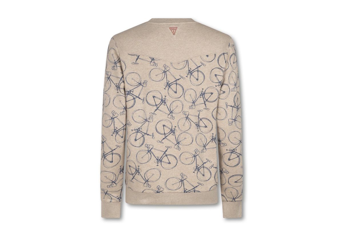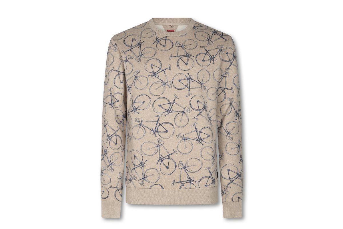 Kiezelgrijze sweater met een opaalblauwe all over bike print. De zachte binnenkant van deze trui is licht opgeruwd (gebrushed) voor extra comfort en zorgt er gegarandeerd voor dat dit je favoriete after-cycling wear wordt. De ronde halslijn zorgt voor een mooie sluitende pasvorm. Le Patron Sweat a Bicyclette draag je op kille dagen en geeft je het vergelijkbare behaaglijke gevoel van een welverdiende afdaling na die eindeloze klim.