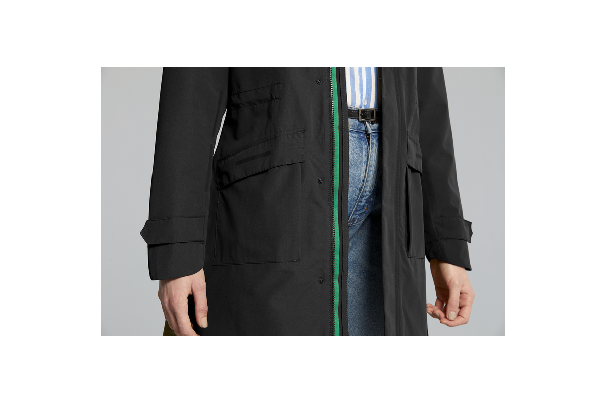 Stijlvol en tijdloos, parka Moss van Basil, speciaal ontworpen voor stadsfietsers, maakt het mogelijk om stijlvol te fietsen goed beschermd tegen wind en regen.
