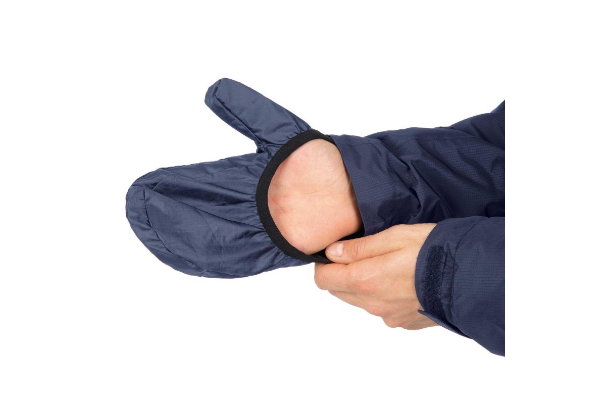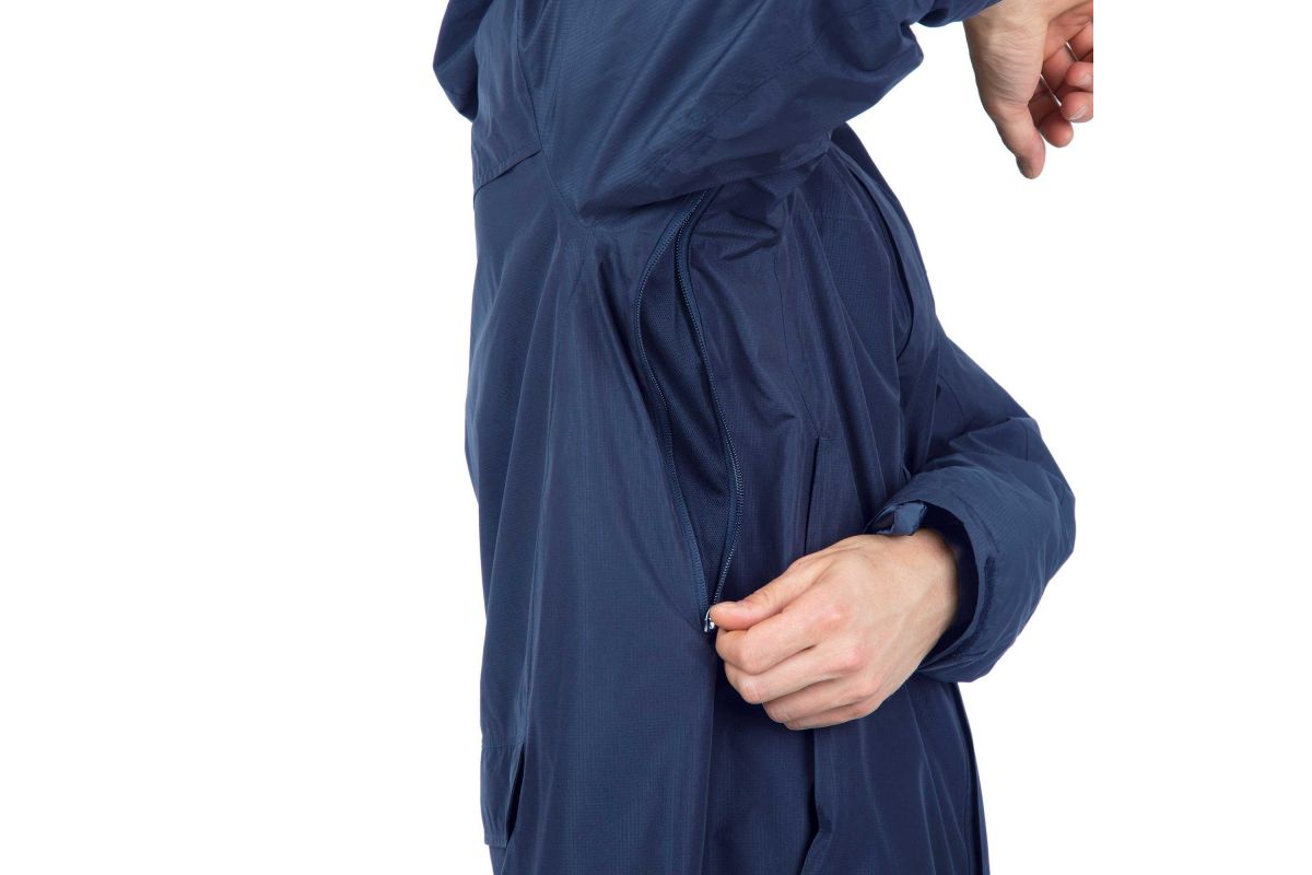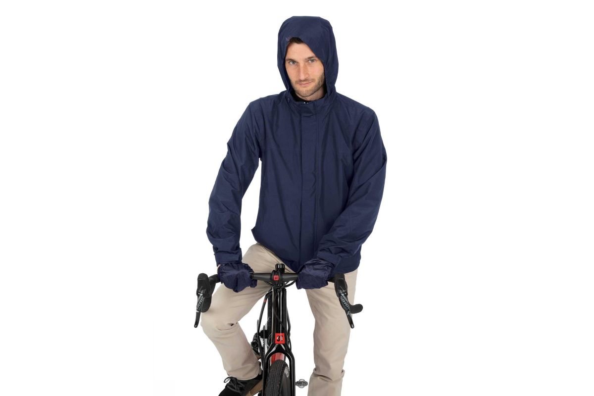 De jas is bedoeld voor regen en is uitgerust met een capuchon en overhandschoenen die in de polsen zijn opgeborgen om je handen droog te houden.