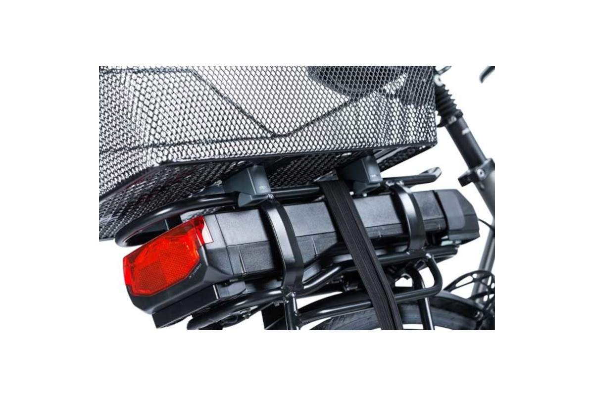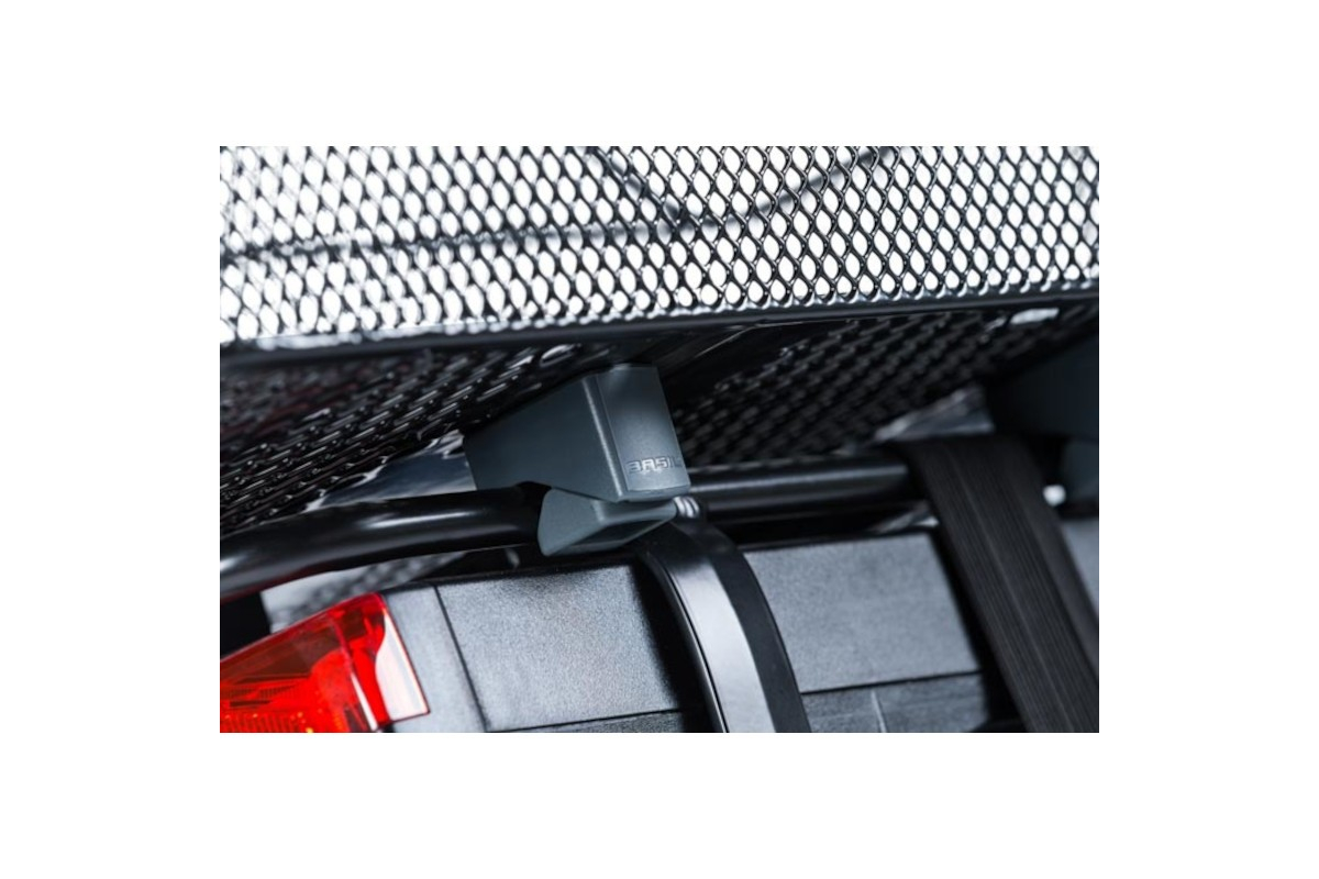 Cento achtermand van het Nederlandse merk Basil, gemaakt van fijn en robuust gaas, wordt vast op je achterbagagerek gepositioneerd via het bevestigingssysteem dat in de set zit.