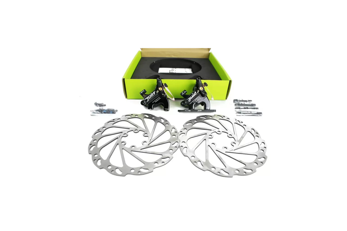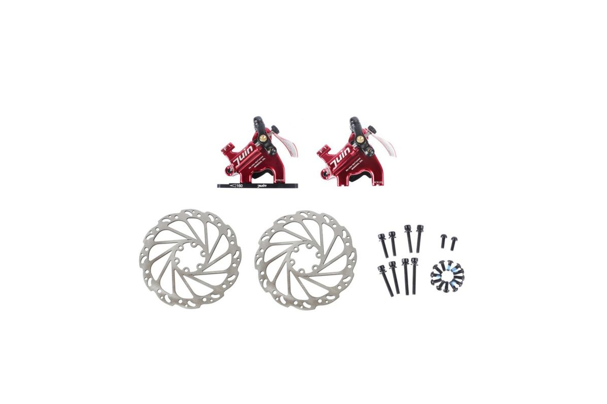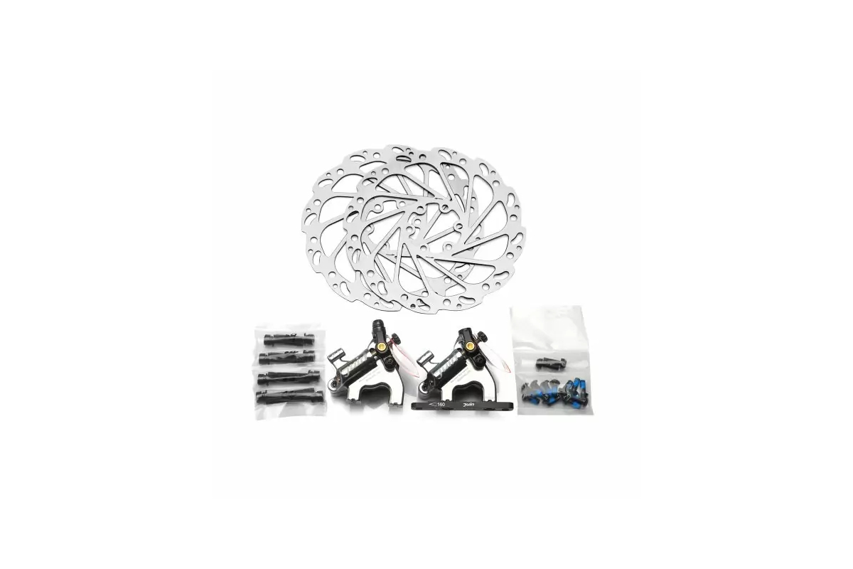 JUIN TECH Hydraulic disc brake activated by cable as standard STI brake lever. Flat mount type, Hydraulic dual piston, Stainless 160mm Rotor. Sold by 2 brakes 2 rotors and 1 front adapters in a box. Pad compatible with shimano M965/966. Body 147g/pc, Rotor 118g