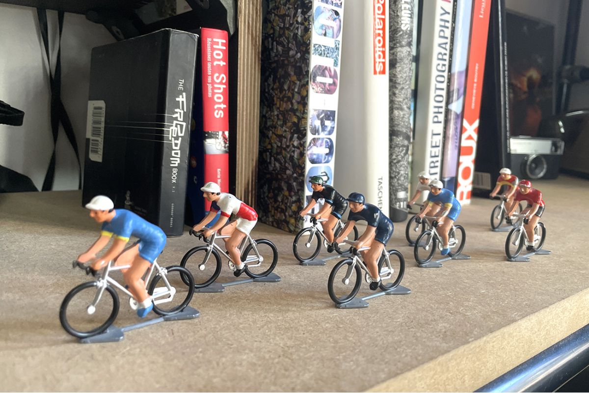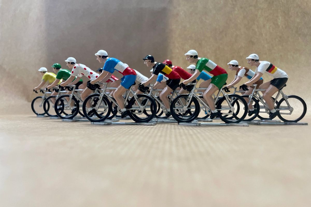 Prachtige handgeschilderde beeldjes van wielrenners die nog steeds in Frankrijk worden gemaakt door de gieterij ROGER, die al sinds de jaren vijftig dezelfde mallen en productiemethoden gebruikt.