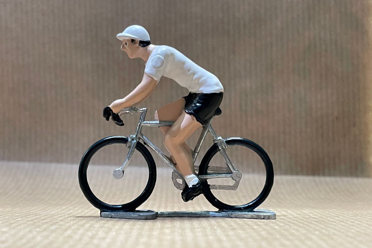 Prachtige handgeschilderde beeldjes van wielrenners die nog steeds in Frankrijk worden gemaakt door de gieterij ROGER, die al sinds de jaren vijftig dezelfde mallen en productiemethoden gebruikt.