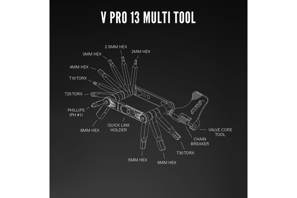 Het bereik van multi-tools voor fietsen Lezyne V PRO is ontworpen om aan de behoeften van veeleisende fietsers te voldoen, of zij nu op de weg, op het zand, op de berg of in de stad. Gebouwd met robuuste materialen zoals chroom-vanadium staal (CRV) en aluminium zijplaten, biedt elk model een essentiële combinatie van gereedschappen voor snel onderhoud en reparaties.