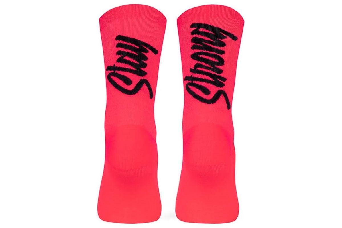 Gedetailleerde specificaties van de Pacific & Co. Stay strong koraalkleurige fietssokken:
