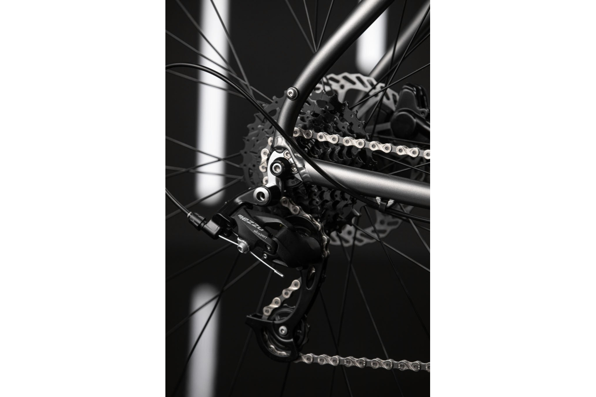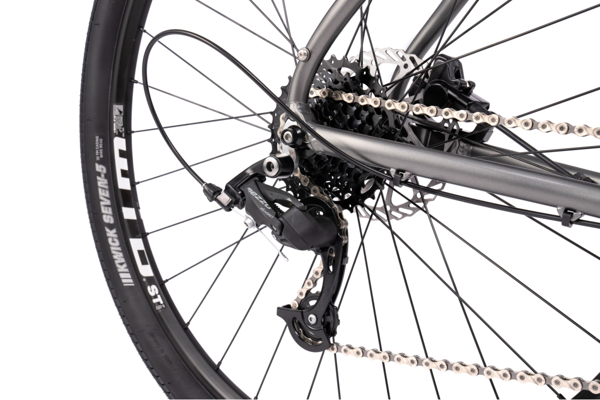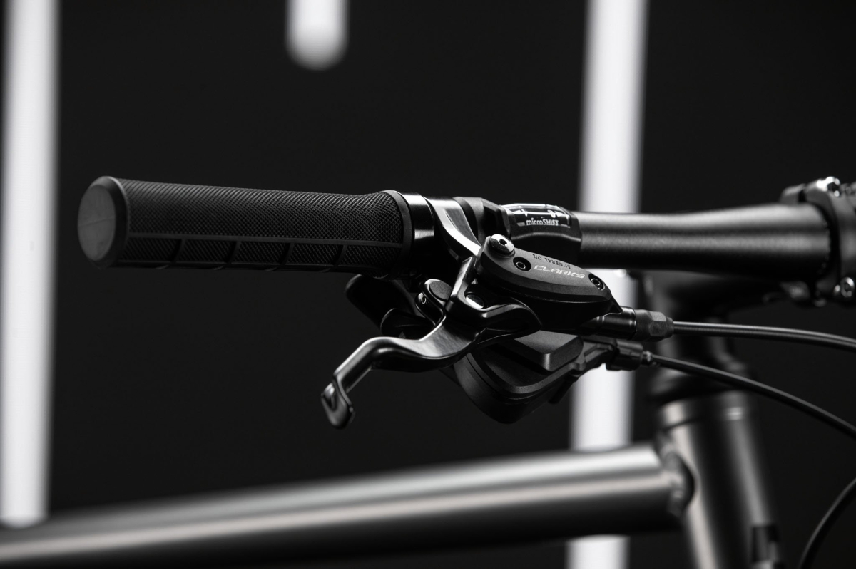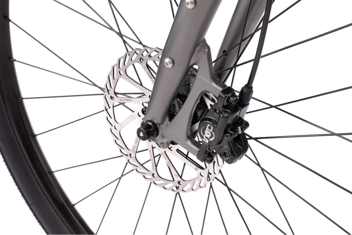 Overdracht Microshift 1x8 is eenvoudig en efficiënt, ideaal voor stedelijke ritten, terwijl de hydraulische schijferremmen Clarks Kleefdier zorgt voor krachtig en constant remmen in alle omstandigheden.