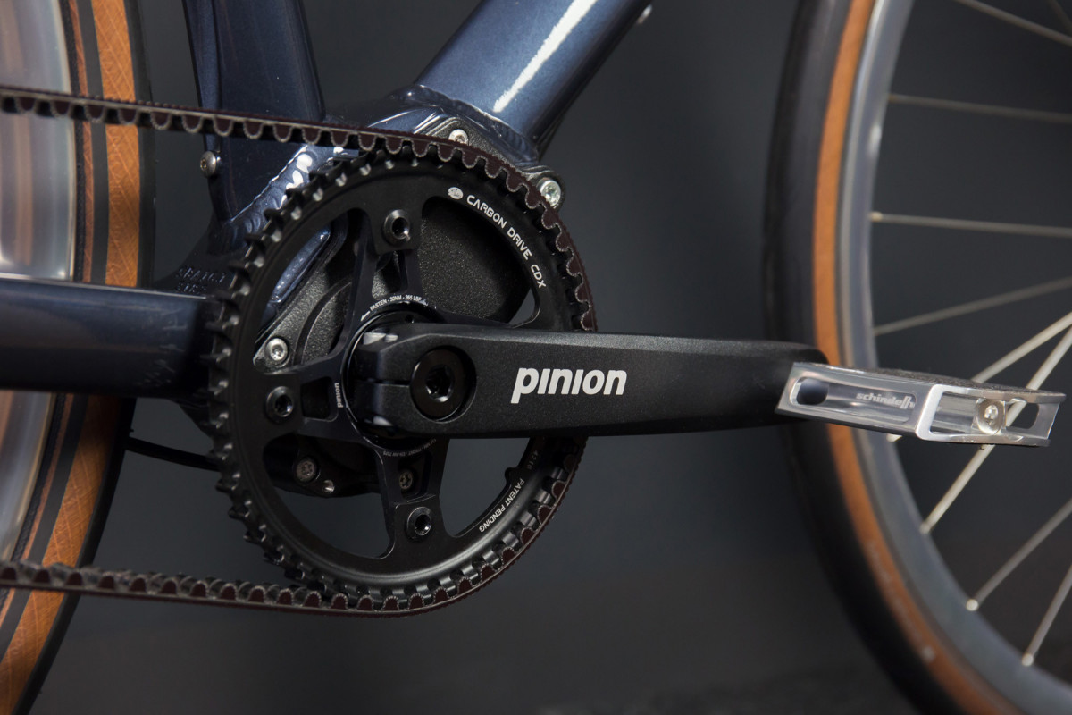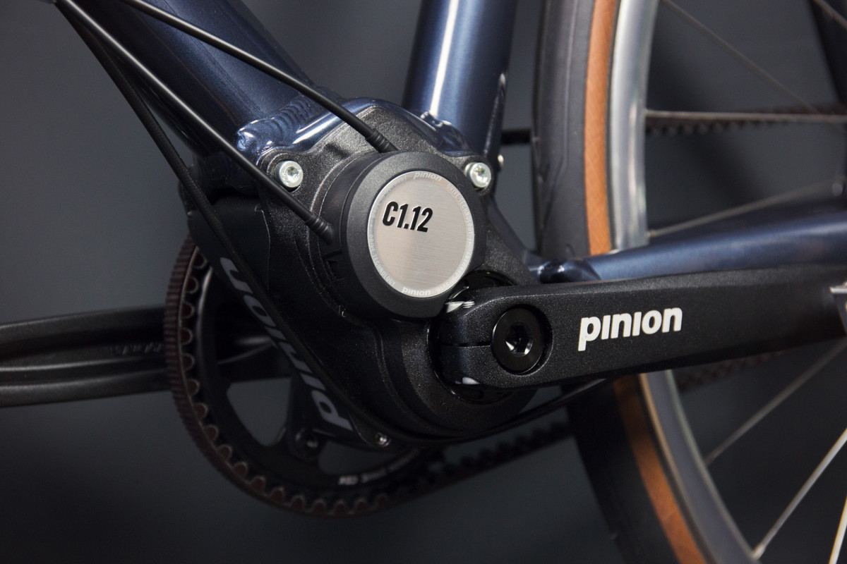 Centraal staat de Pinion C-Line-versnellingsbak met zijn lichte magnesiumbehuizing. Pinion C-Line-aandrijvingen zijn de kleinste en toch krachtigste centrale versnellingsbakken op de markt. Dit model wordt geleverd met 6, 9 of 12 versnellingen. De compacte versnellingsbak past perfect in het framedesign en wordt geleverd met een zeer veerkrachtige poedercoating.