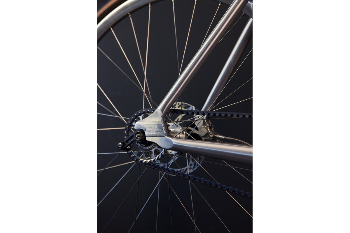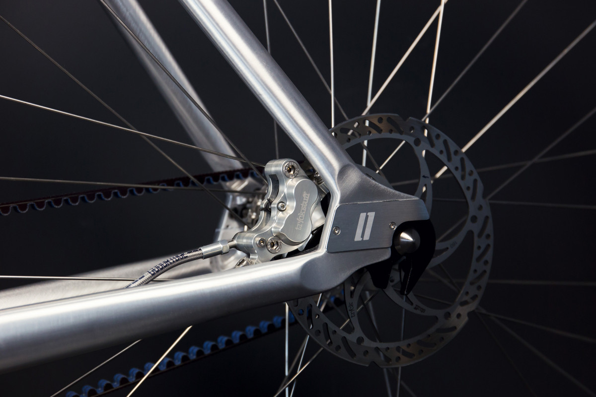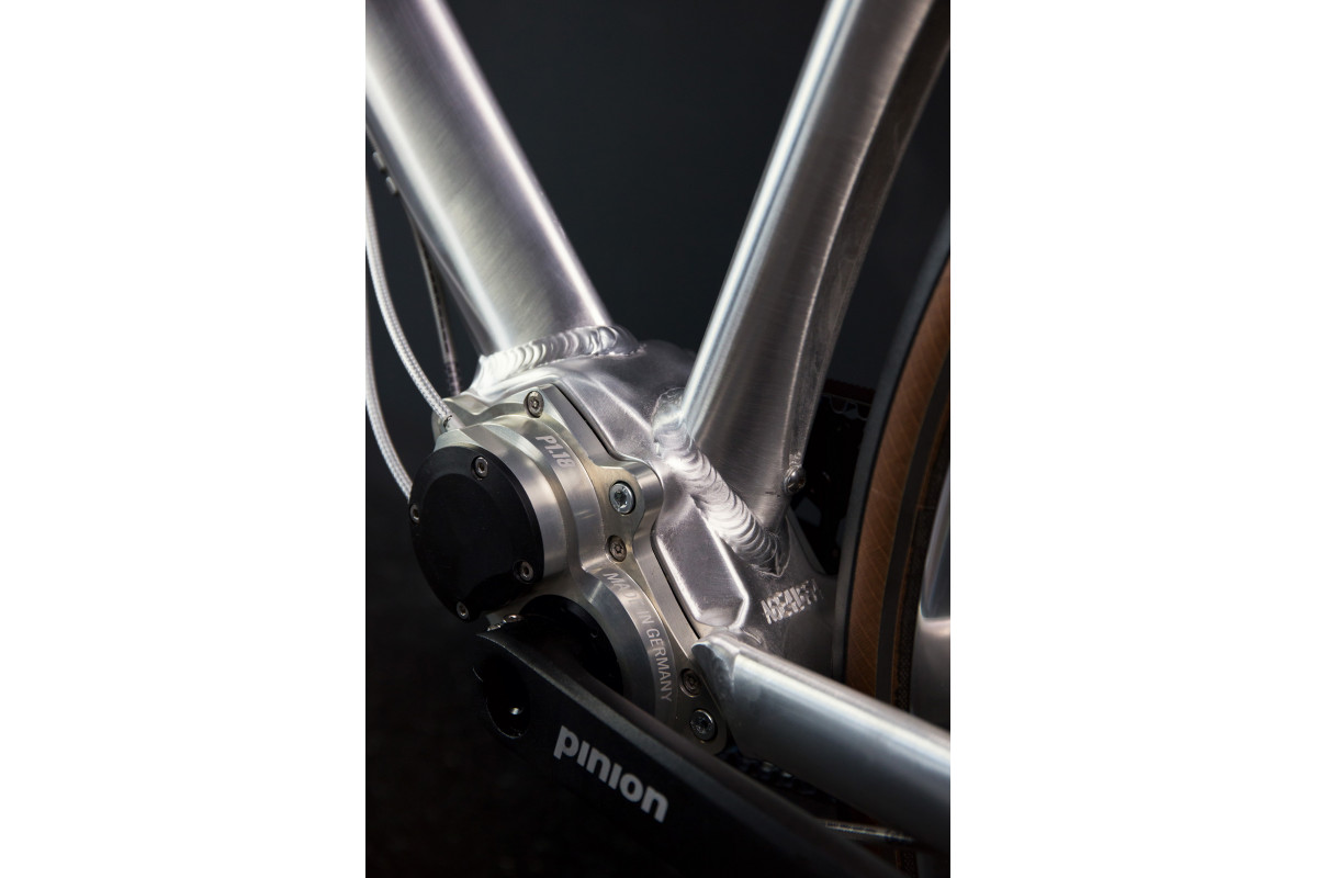 Aluminium (AL6061-T6), triple butted aero tubing, forged dropouts with slider-belt-tensioning-system and Schindelhauer belt port, integrated seat post clamp, smooth welded, Pinion bracket