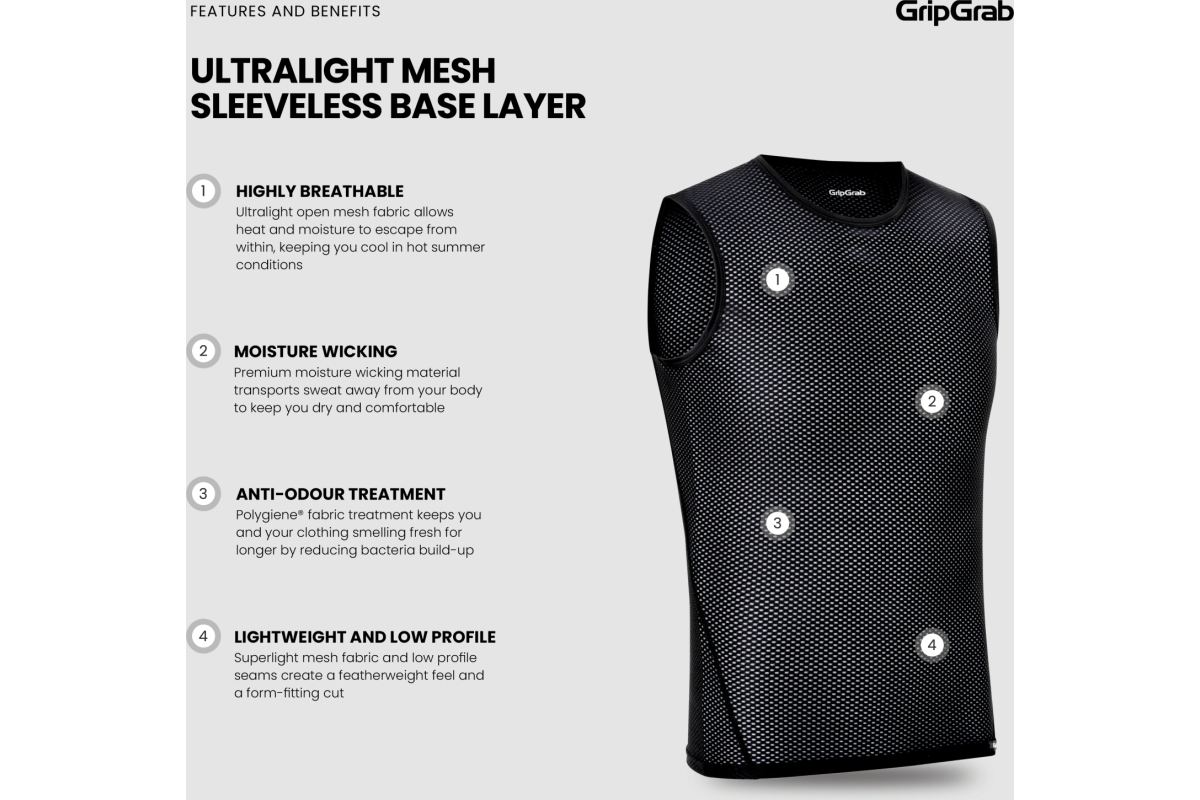 De onderkleding zonder mouwen van ultralichtnet GripGrab is uw keuze voor fietsen in warm weer. De open gaasstof laat je huid ademen terwijl het zweet wegloopt, waardoor je droog en comfortabel blijft.