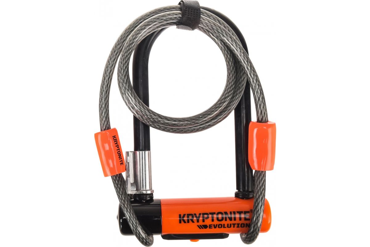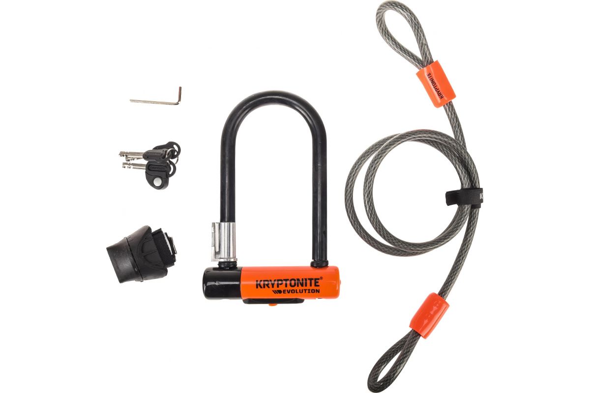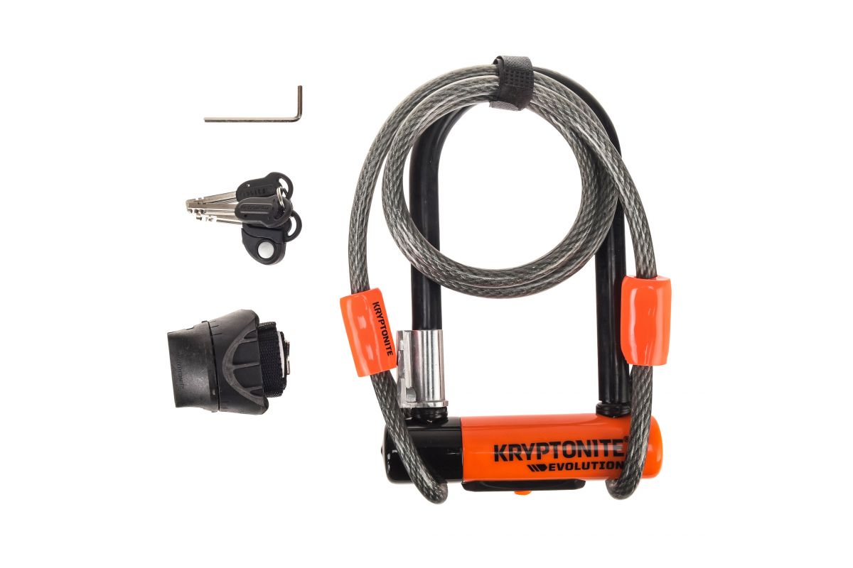 Antidiefstal slot Kryptonite EVOLUTION (beveligingsniveau 7/10) met bijgeleverde flex kabel om je wielen en zadel mee vast te zetten.