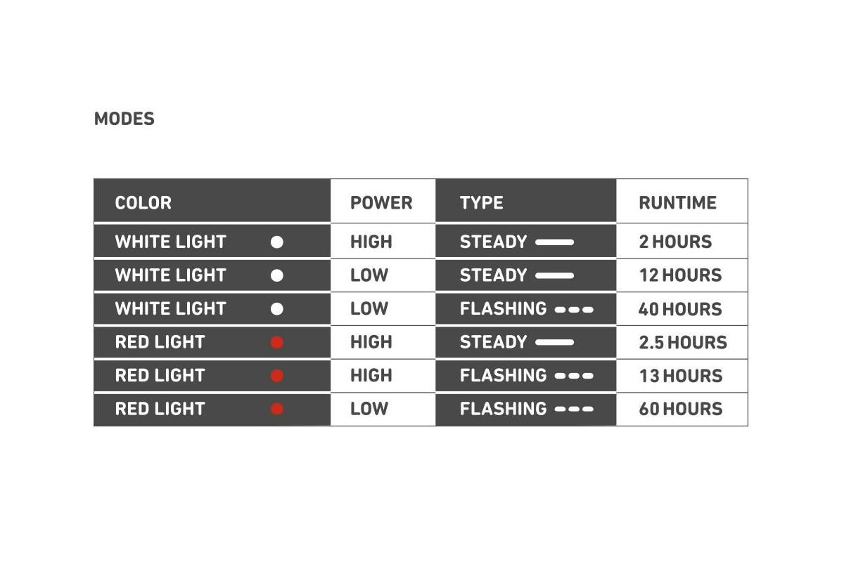 Elk licht is uitgerust met witte en rode LED's, zodat u kunt schakelen tussen wit licht voor de voorzijde en rood licht voor de rug.