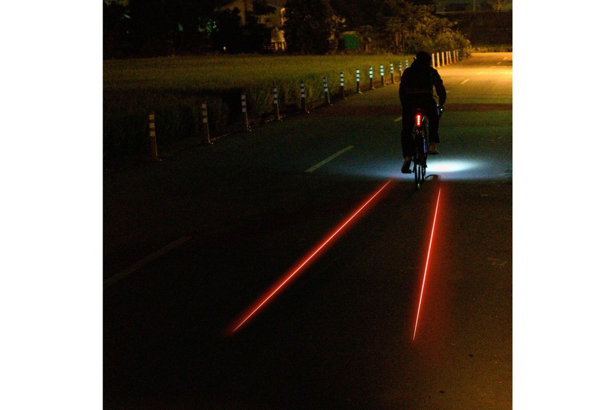 Compact, zeer krachtig met zijn vier LED's'achterlicht vélo GELEID Lezyne Laser Drive heeft naast twee laserzenders plannen maken twee lijnen op de grond om de automobilisten te waarschuwen dat je op de weg bent.